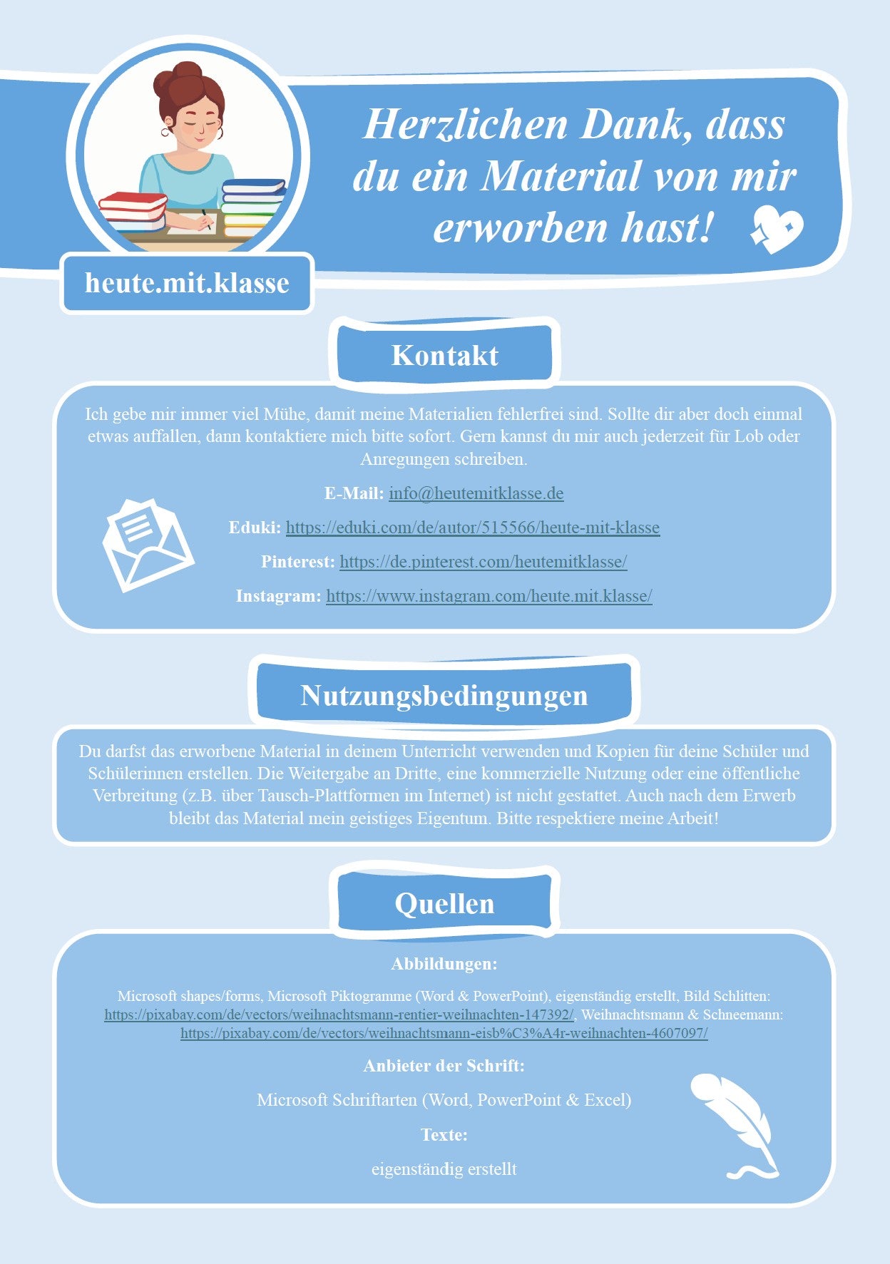 Du darfst das erworbene Material in deinem Unterricht verwenden und Kopien für deine Schülerinnen und Schüler erstellen. Die Weitergabe an Dritte, eine kommerzielle Nutzung oder eine öffentliche Verbreitung (z.B. über Tausch-Plattformen im Internet) ist nicht gestattet. Auch nach dem Erwerb bleibt das Material mein geistiges Eigentum.