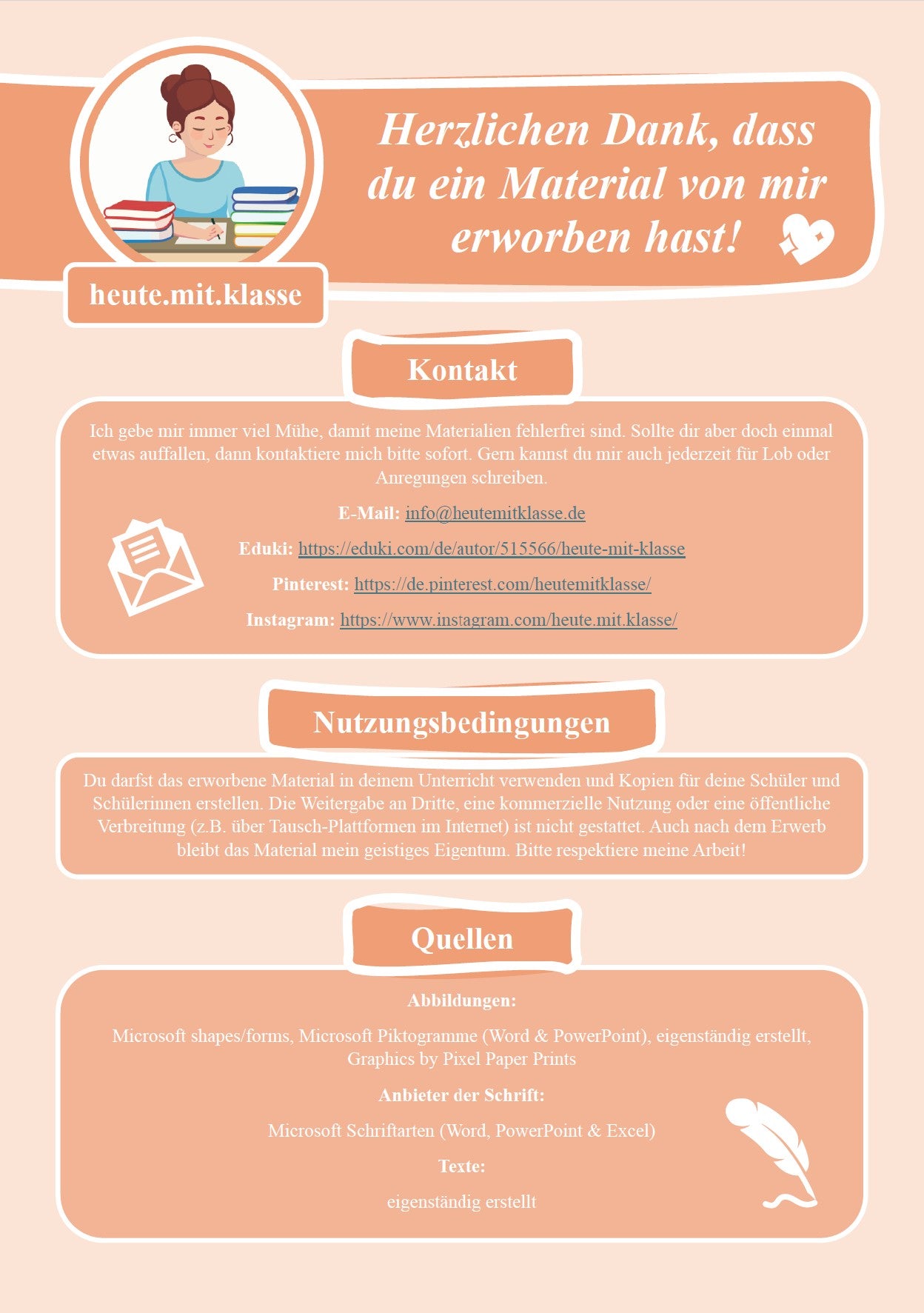 Du darfst das erworbene Material in deinem Unterricht verwenden und Kopien für deine Schülerinnen und Schüler erstellen. Die Weitergabe an Dritte, eine kommerzielle Nutzung oder eine öffentliche Verbreitung (z.B. über Tausch-Plattformen im Internet) ist nicht gestattet.